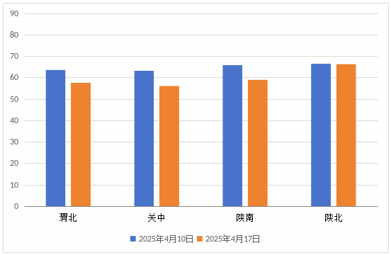 与4月10日监测结果相比:(0-20cm)土壤相对含水量渭北、关中、陕南、陕北分别下降了4.7、4.4、7.0、0.1个百分点;(20-40cm)土壤相对含水量渭北、关中、陕南、陕北分别下降了6.0、7.1、6.8、0.2个百分点。