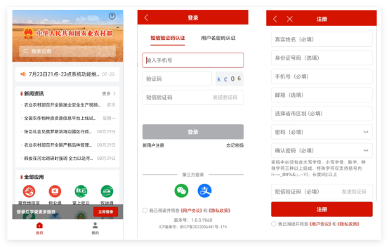 2.农政通注册。新用户需进入农政通微信小程序/APP,选择“立即登录”按钮,进行注册操作。选择“新用户注册”按钮,跳转到注册页面,已有账号的可使用微信或支付宝绑定登录。注册需填写姓名、身份证号、手机号、省市区信息、初始密码等信息,填写完成后获取验证码并填入,提交完成注册,详细操作见图4-2。