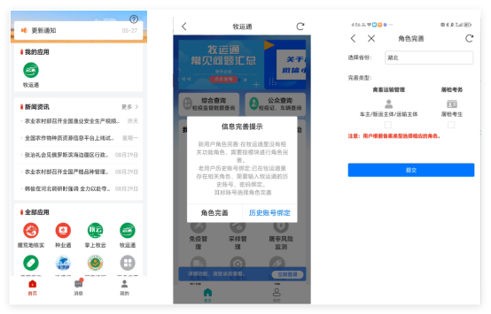 初次使用“牧运通”子模块,系统会提示:“信息完善提示”需要完善相关角色,点击“角色完善”,选择对应省份,完善类型:选择对应“屠检考生”进行提交。如果是“牧运通”子模块的历史用户,则点击“历史账号绑定”,输入历史账号、密码进行绑定。详细操作见图4-3。
