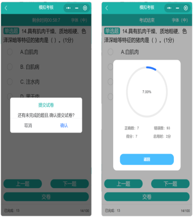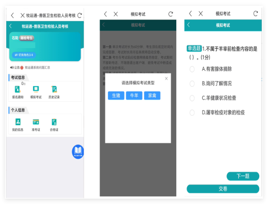 5.模拟考核。屠检考生在“兽医卫生检验人员考核信息系统”模块首页点击“模拟考核”图标即可进行模拟考核测试,模拟考核每天每个畜种限制2次,每次考核提交后会立即生成考核成绩,详细操作见图4-5。