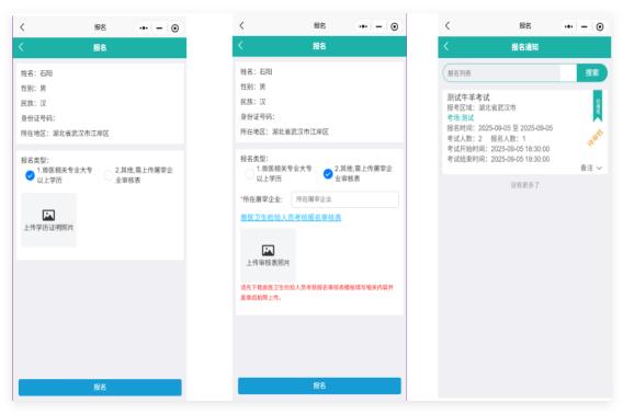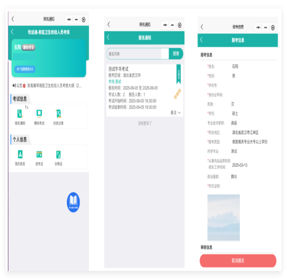 考核报名时需要选择报名的类型,如果是兽医相关专业人员进行报名,需要上传学历证明照片;选择其他类型则需要下载“兽医卫生检验人员考核报名审核表”,填写审核表上的相关信息后,经所在企业确认盖章并拍照上传进行报名(注:如果屠宰企业为新建状态,则选择拟新建屠宰企业)。报名成功后,报名信息为待审核状态,待管理人员审核通过后可以参加正式考核,详细操作见图4-8。