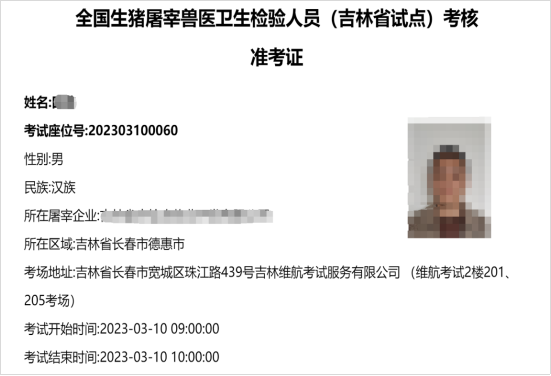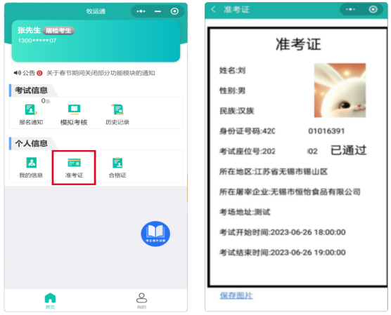8.屠检考生打印准考证。当兽医卫生检验人员考核信息系统管理用户审核完成后,屠检考生可以登陆“农政通”微信小程序/APP中的“牧运通”子模块,在个人信息“准考证”里面查询自己的准考证,保存图片到手机相册后进行打印,操作流程见图4-10。准考证也可由考务人员在电脑端打印后发放给应考人员,电脑端打印的准考证式样见图4-11。