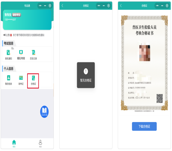 9.屠检考生考核合格证。参加正式考核且考核合格的人员,待管理用户确认考核成绩后,可在“合格证”功能中查看自己的合格证,若正式考核不合格则没有合格证信息,详细操作见图4-12。