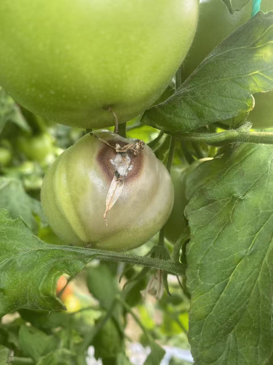 这是番茄灰霉病最典型的症状,多从果实的脐部、果柄处或伤口侵入。发病初期,果实表面出现水渍状浅褐色小斑点,随后斑点迅速扩大,病部变软腐烂,表面覆盖一层灰色霉层,这是病菌的分生孢子梗和分生孢子,也是识别该病的关键特征。后期病果会脱落或失水僵化。